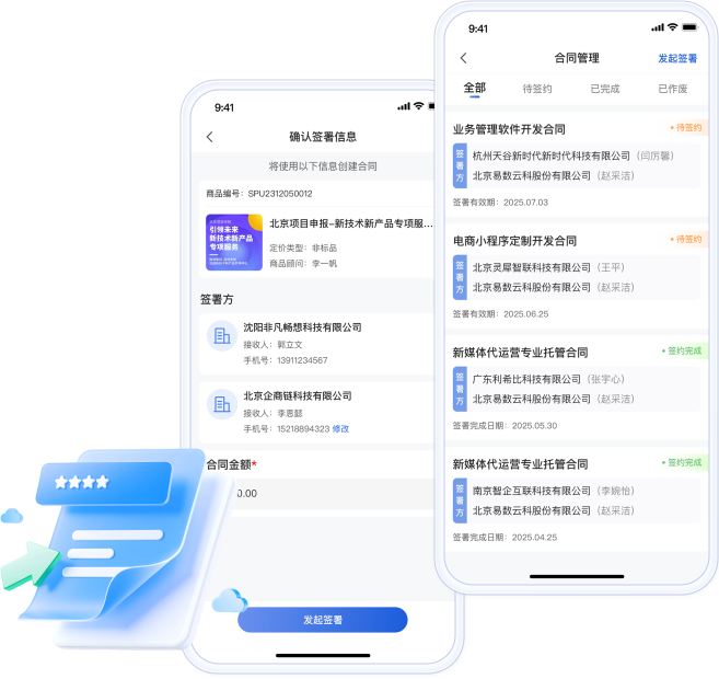 在签约环节实现高效在线签约。企服公司创建上传待签约的合同后,客户可在APP端直接查看、确认并完成在线签约。整个过程便捷安全,具有法律效力,确保交易高效合规,有效避免纠纷,提升业务成交效率。
