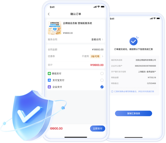 平台支持B2B对公支付,为企业交易提供合规、高效的线上支付解决方案。该功能无缝嵌入服务流程,支付行为与合同、服务单自动关联,确保资金流转清晰可控,极大增强交易双方的信任度,以可靠的支付闭环为最终成交保驾护航。